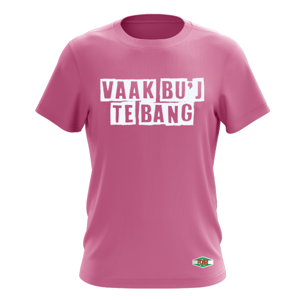 Geef je garderobe een flinke dosis karakter met het “Vaak Bu’j Te Bang” T-shirt. Stoer, eigenwijs en bovenal: eerlijk. Bestel nu en laat de wereld weten dat jij er niet omheen draait.
